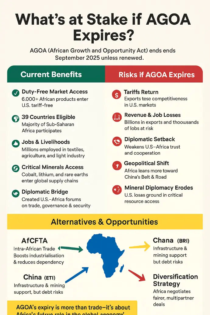 The countdown has begun. The African Growth and Opportunity Act (AGOA), a cornerstone of U.S.–Africa trade relations since 2000, is set to expire in September 2025 unless reauthorized by Washington. For Africa, AGOA has provided more than duty-free access to U.S. markets; it has created opportunities, supported livelihoods, and shaped diplomatic engagement. Yet as the deadline approaches, one question echoes across boardrooms and ministries: what does Africa stand to lose if AGOA disappears?