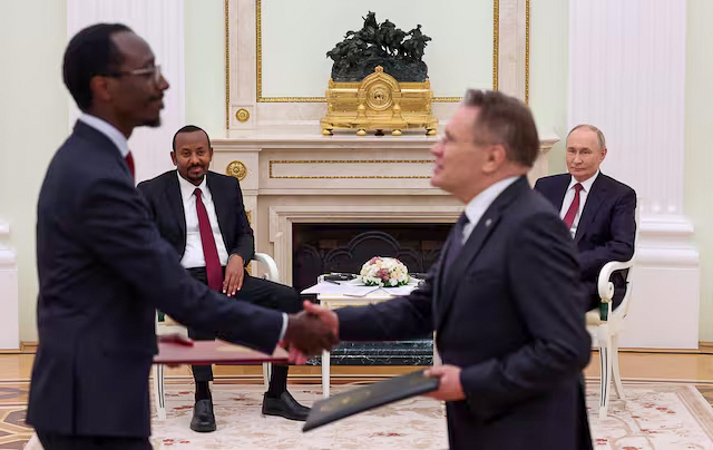Russia's President Vladimir Putin and Ethiopia’s Prime Minister Abiy Ahmed watch Director General of Russia's State Atomic Energy Corporation Rosatom Alexei Likhachev and Ethiopia’s Foreign Minister Gedion Timothewos exchanging documents during a meeting in Moscow, Russia, September 25, 2025.