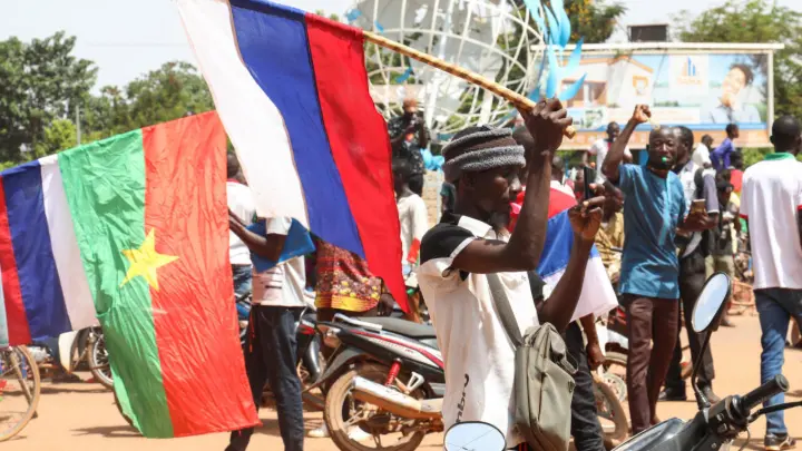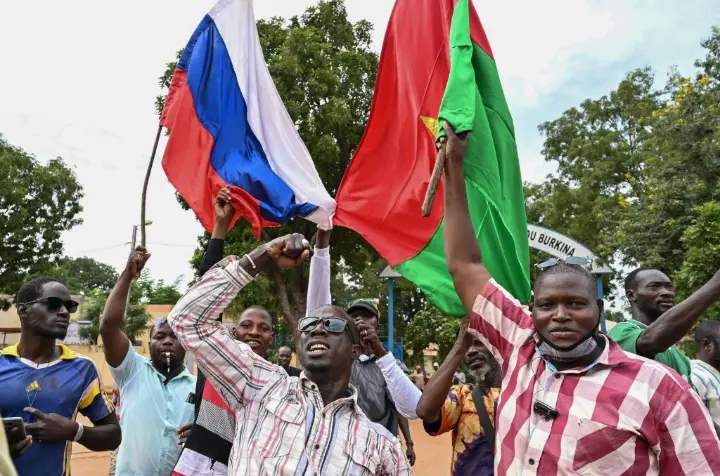 Supporters of Burkina Faso's new junta wave Burkina Faso and Russian flags at a protest in Ouagadougou in 2022. Photo by Vincent Bado, Reuters