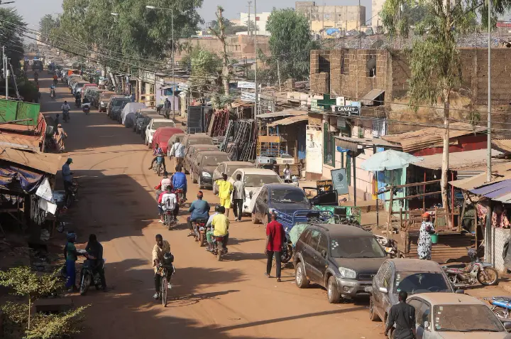 People gather at a petrol station amid ongoing fuel shortages caused by a blockade imposed by al Qaeda-linked insurgents in early September, in Bamako, Mali, November 1, 2025.